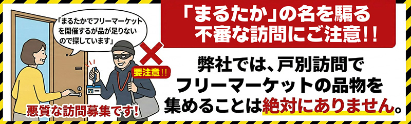 この度、お客様より「まるたかでフリーマーケットを開催するため、品物が足りないので探している」と名乗り、ご自宅を戸別訪問する人物がいるとの情報が寄せられました。